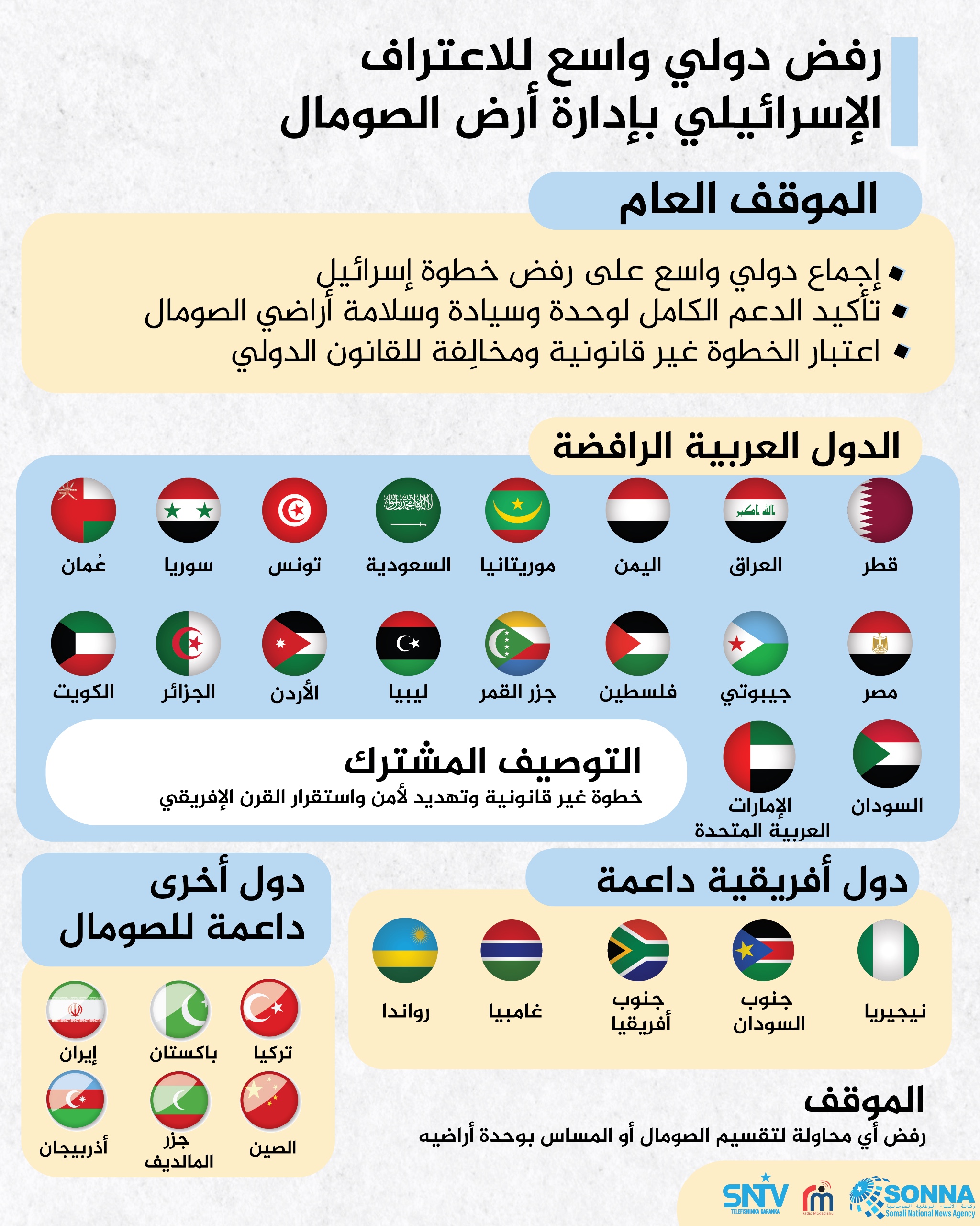 كما يستعرض الإنفوجرافك قائمة بالدول العربية والأفريقية، إلى جانب دول أخرى، التي أعلنت رفضها للاعتراف، فضلًا عن مواقف منظمات إقليمية ودولية أكدت التزامها بدعم وحدة الصومال ورفض أي محاولة لتقسيمه أو المساس بسيادته.
