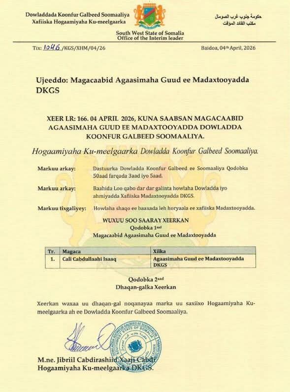 مقديشو 16 شوال 1447هـ الموافق 04 أبريل 2026م (صونا) – أصدر الحاكم المؤقت لولاية جنوب الغرب السيد جبريل عبد الرشيد حاجي عبدي،اليوم السبت،مرسوماً يقضي بتعين السيد علي عبدالله إسحاق مديراً عاماً للقصر الرئاسي للولاية.