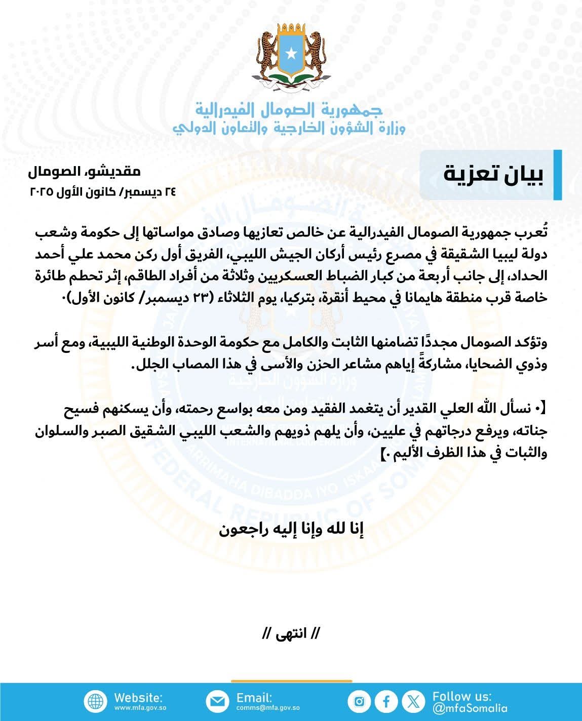 مقديشو 04 رجب 1447 هـ الموافق 24 ديسمبر 2025 م (صونا) – أعربت جمهورية الصومال الفيدرالية عن خالص تعازيها وصادق مواساتها إلى حكومة وشعب دولة ليبيا الشقيقة، في مصرع رئيس أركان الجيش الليبي، الفريق أول ركن محمد علي أحمد الحداد، إلى جانب أربعة من كبار الضباط العسكريين وثلاثة من أفراد الطاقم، إثر تحطم طائرة خاصة قرب منطقة هايمانا في محيط أنقرة بتركيا، يوم الثلاثاء 23 ديسمبر/كانون الأول.
