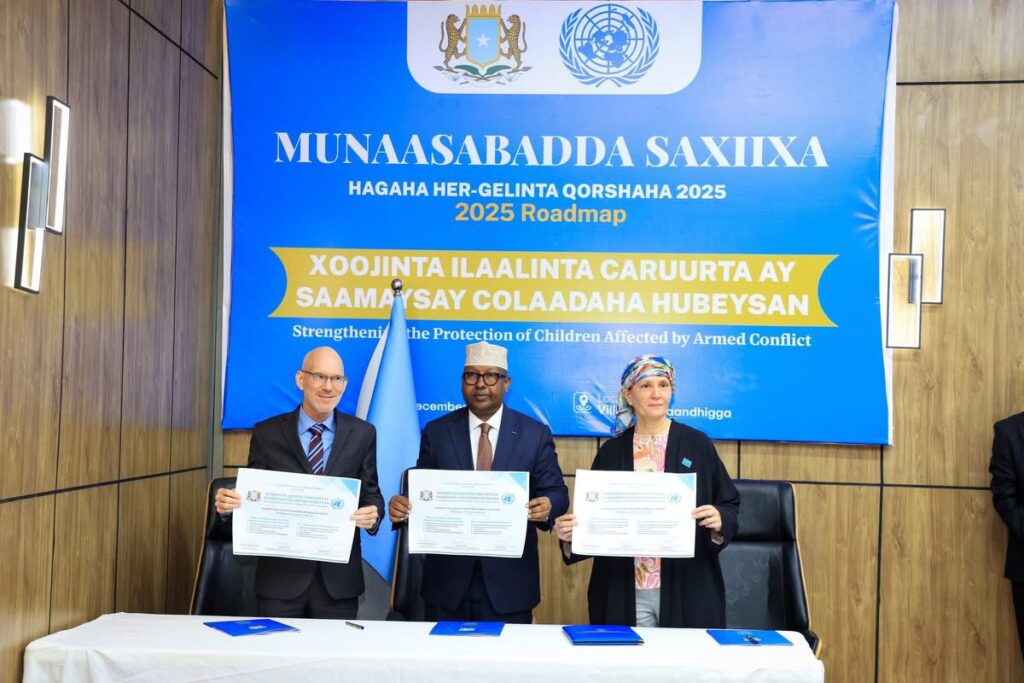 مقديشو 26 جمادى الآخرة 1447هـ الموافق 17 ديسمبر 2025م (صونا) – وقعت الحكومة الفيدرالية والأمم المتحدة ،اليوم الأربعاء ،على خطة لتعزيز حماية الأطفال المتأثرين بالنزاعات المسلحة.