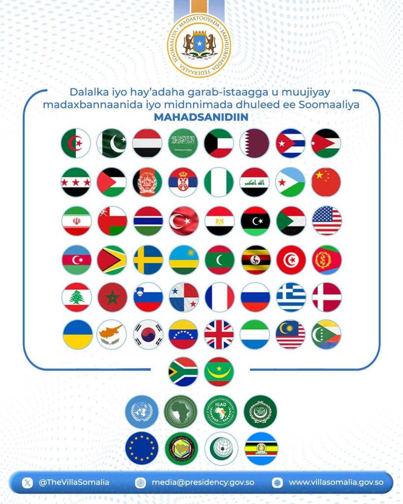 مقديشو / وكالة صونا- أعربت جمهورية الصومال الفيدرالية عن بالغ شكرها وتقديرها للدول والهيئات الإقليمية والدولية التي وقفت بمسؤولية إلى جانب سيادة الصومال ووحدته الوطنية، وأسهمت في إحباط محاولات إسرائيل الرامية إلى الاعتراف بما يُسمّى إدارة «صوماليلاند».