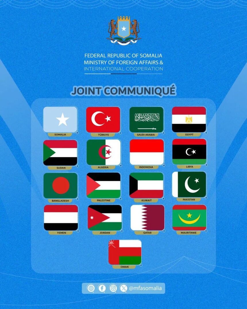 ويؤكد البيان المشترك اعتراف المجتمع الدولي بالمؤسسات الدستورية في الصومال باعتبارها الممثل الشرعي الوحيد للشعب الصومالي، وهو ما يعزز الجهود الوطنية الرامية إلى ترسيخ وحدة البلاد والحفاظ على سلامة أراضيها.