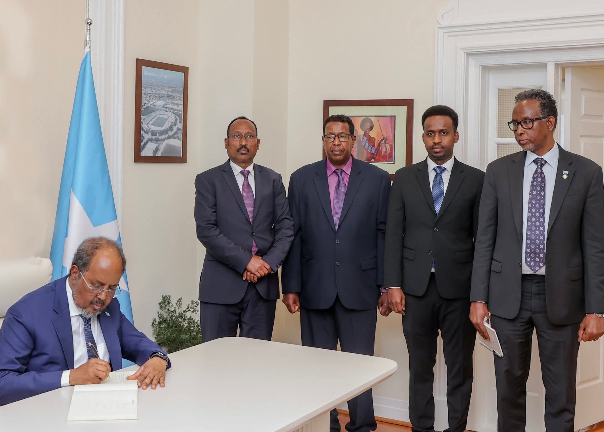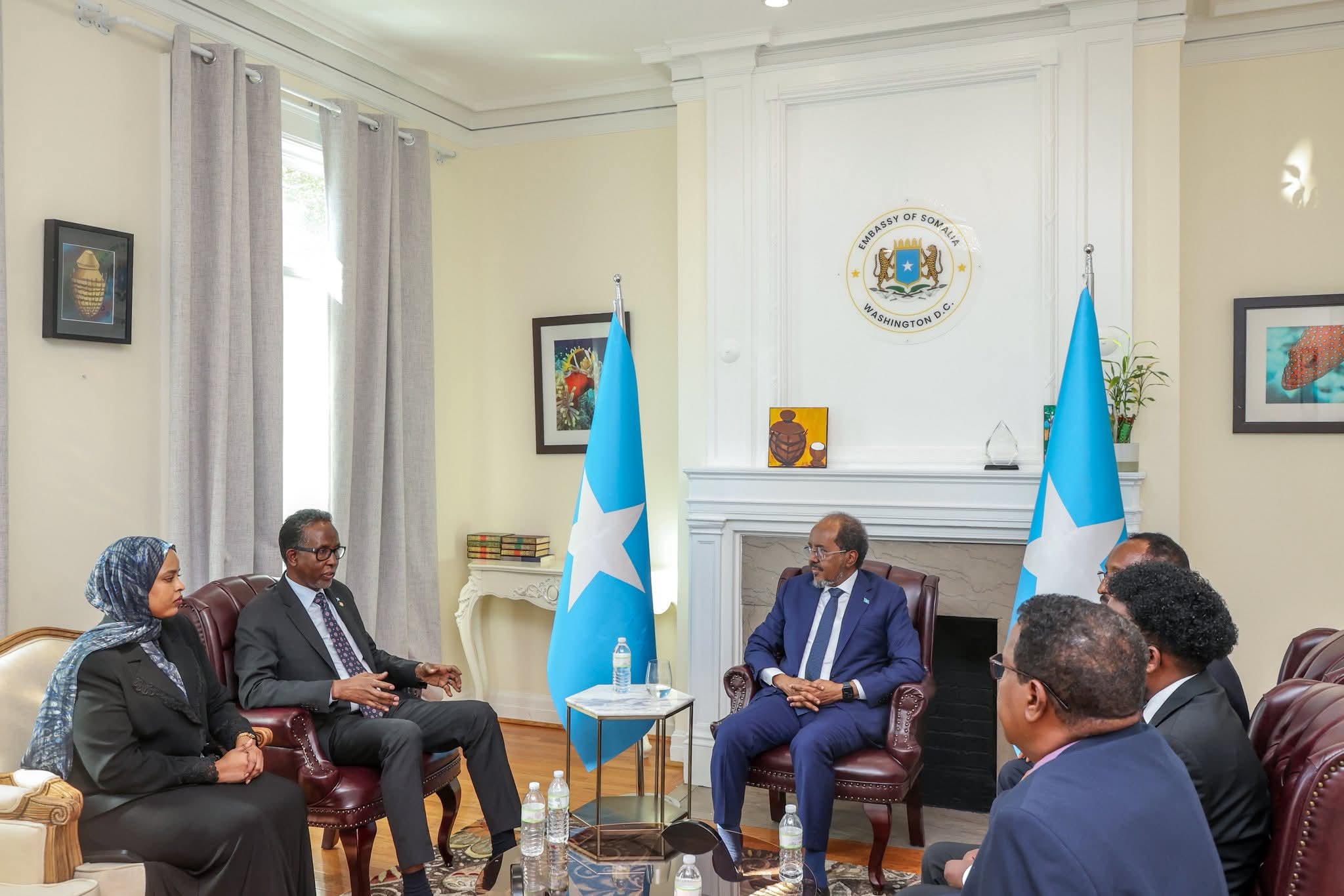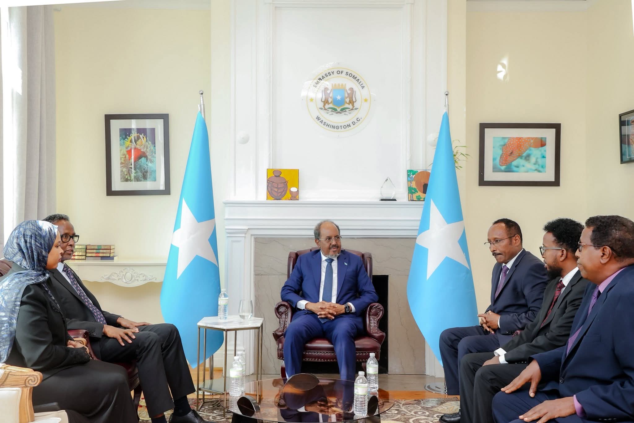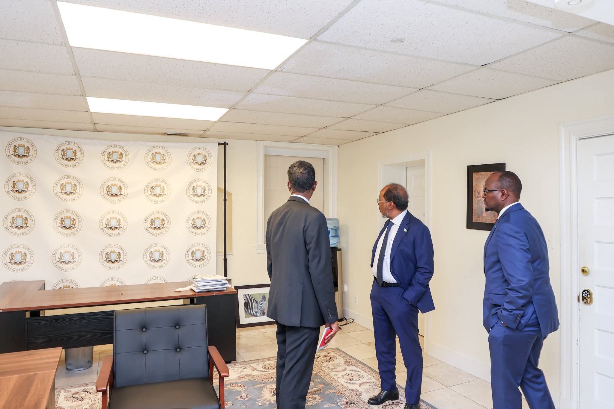 واشنطن 05 ربيع الثاني 1447 هـ الموافق 27 سبتمبر 2025 م(صونا) – زار رئيس الجمهورية، فخامة الدكتور حسن شيخ محمود، الذي يقوم بزيارة عمل إلى الولايات المتحدة، مقر السفارة الصومالية في مدينة واشنطن.