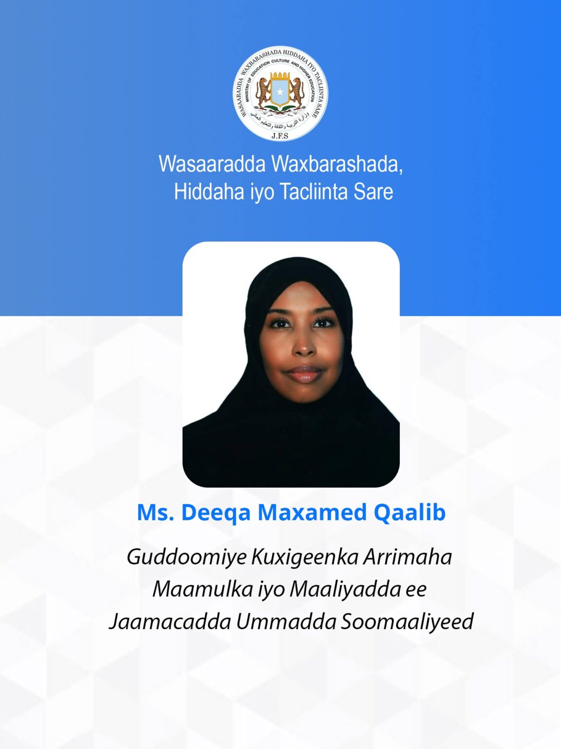 مقديشو 13 شعبان 1447 هـ الموافق 01 فبراير 2026 م (صونا)- أصدر ريس الجمهورية فخامة حسن شيخ محمود،اليوم الأحد،مرسوماً يقضي بتعين نواب جدد لرئيس الجامعة الوطنية .