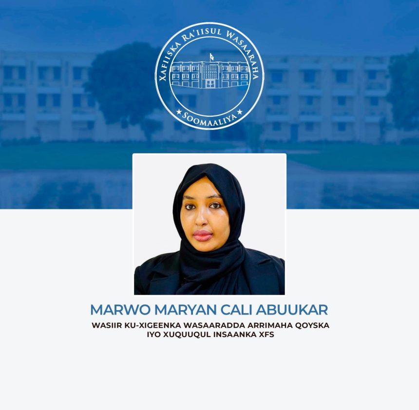 مقديشو 18 جمادى الأولى 1447 هـ الموافق 09 نوفمبر 2025 م (صونا)- عين رئيس الوزراء، دولة السيد حمزة عبدي بري، اليوم، في مرسوم له، السيدة مريم علي أبوبكر نائبة لوزيرة الأسرة وتنمية حقوق الإنسان.