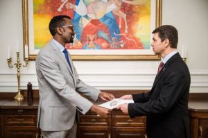 كييف / وكالة صونا – قدّم سعادة السفير محمد عبد الله أحمد، الأربعاء أوراق اعتماده إلى فخامة رئيس جمهورية أوكرانيا السيد فولوديمير زيلينسكي، كسفيرٍ لجمهورية الصومال الفيدرالية لدى أوكرانيا، والمقيم في العاصمة الصربية بلغراد.