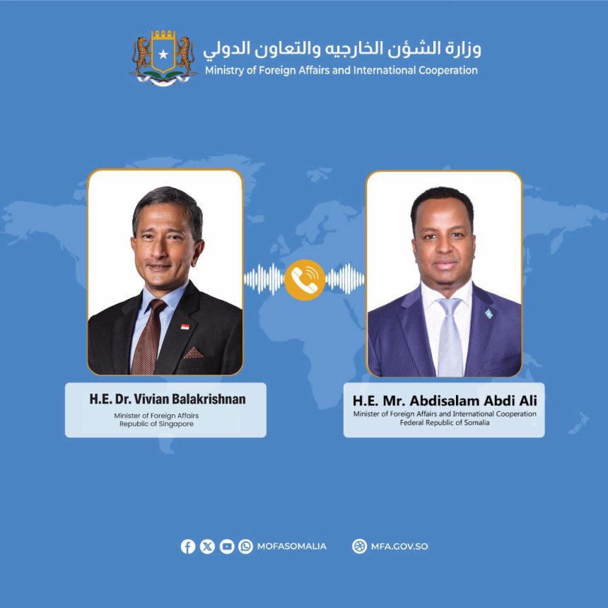 مقديشو/ وكالة صونا- أجرى وزير الشؤون الخارجية والتعاون الدولي في الحكومة الفيدرالية ، معالي السيد عبدالسلام عبدي علي، اتصالًا هاتفيًا يوم الجمعة مع نظيره السنغافوري، معالي الدكتور فيفيان بالاكريشنان.