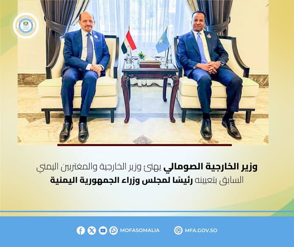 مقديشو 27 رجب 1447 هـ الموافق 16 يناير 2026 م (صونا) – هنأ وزير الشؤون الخارجية والتعاون الدولي، معالي عبدالسلام عبدى علي، اليوم الجمعة، وزير الخارجية وشؤون المغتربين السابق لليمن، معالي الدكتور شائع محسن الزنداني ، بمناسبة تعيينه رئيسًا لمجلس وزراء الجمهورية اليمنية الشقيقة، وذلك عقب صدور قرار رئاسي مساء الخميس (١٥ يناير / كانون الثاني) عن رئيس مجلس القيادة الرئاسي اليمني بتكليفه بتشكيل حكومة جديدة، في خطوة تُعد مهمة لتعزيز المسار السياسي والدستوري في اليمن.