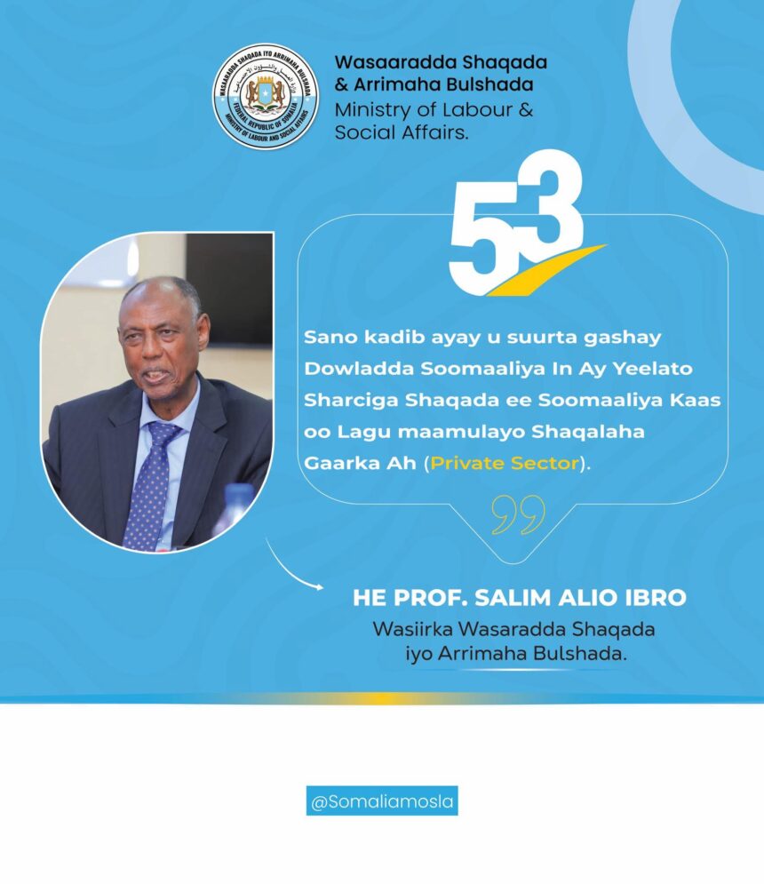 مقديشو 19 شعبان 1447 هـ الموافق 07 فبراير 2026 م (صونا)- أكد وزير العمل والشؤون الاجتماعية البرفسور سالم عليو إبرو،أن قانون العمل الوطني المحدث يتماشي مع معايير العمل الدولية ،ويؤسس نظام عمل قائم على العدالة والشفافية وحماية حقوق العمال وأصحاب العمل.