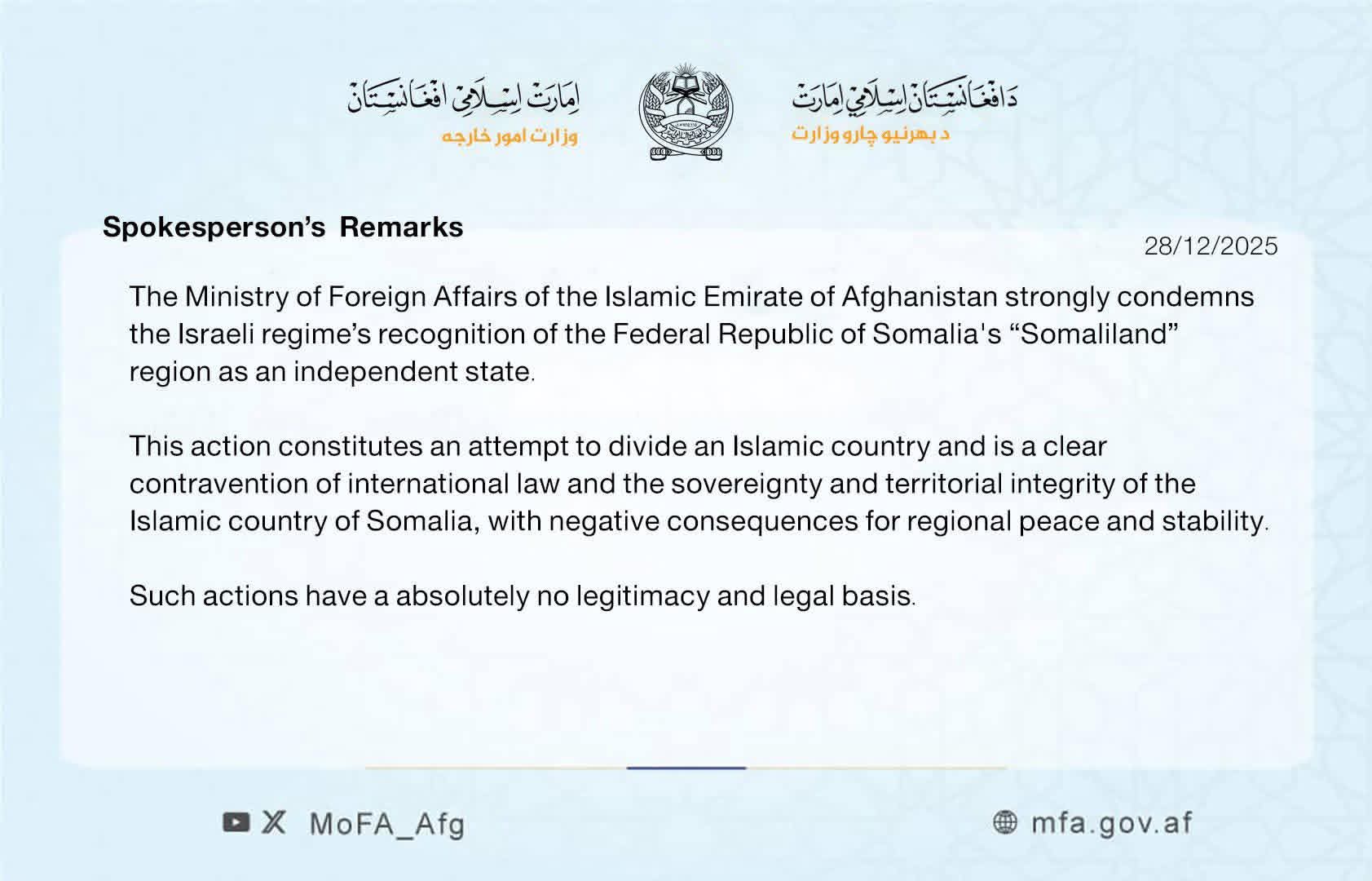 KABUL, Afghanistan – The Ministry of Foreign Affairs of the Islamic Emirate of Afghanistan has issued a strong condemnation regarding the Israeli regime’s recognition of the Somaliland region as an independent state. In a formal statement released on Sunday, the Ministry denounced the move as a calculated attempt to fragment the unity of the Federal Republic of Somalia, warning that such actions carry no legal validity.