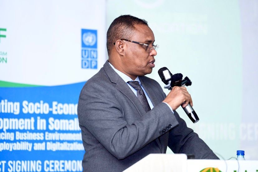 Mogadishu, (SONNA) – The Second Deputy Prime Minister of the Federal Government of Somalia, H.E. Jibril Abdirashid Haji Abdi, attended the signing ceremony of the Somalia Economic and Social Acceleration Project, a joint initiative between the Federal Government of Somalia, the United Nations Development Programme (UNDP), and several Somali private sector companies.