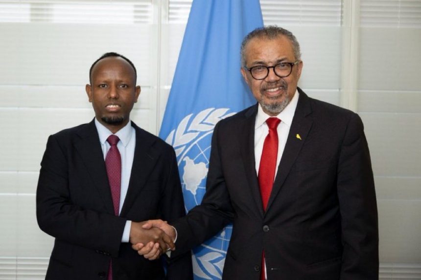 Mogadishu (SONNA) — The Minister of Health and Social Care of the Federal Government of Somalia, Dr. Ali Haji Aden, held a fruitful meeting in Geneva with the Director-General of the World Health Organization (WHO), Dr. Tedros Adhanom Ghebreyesus.