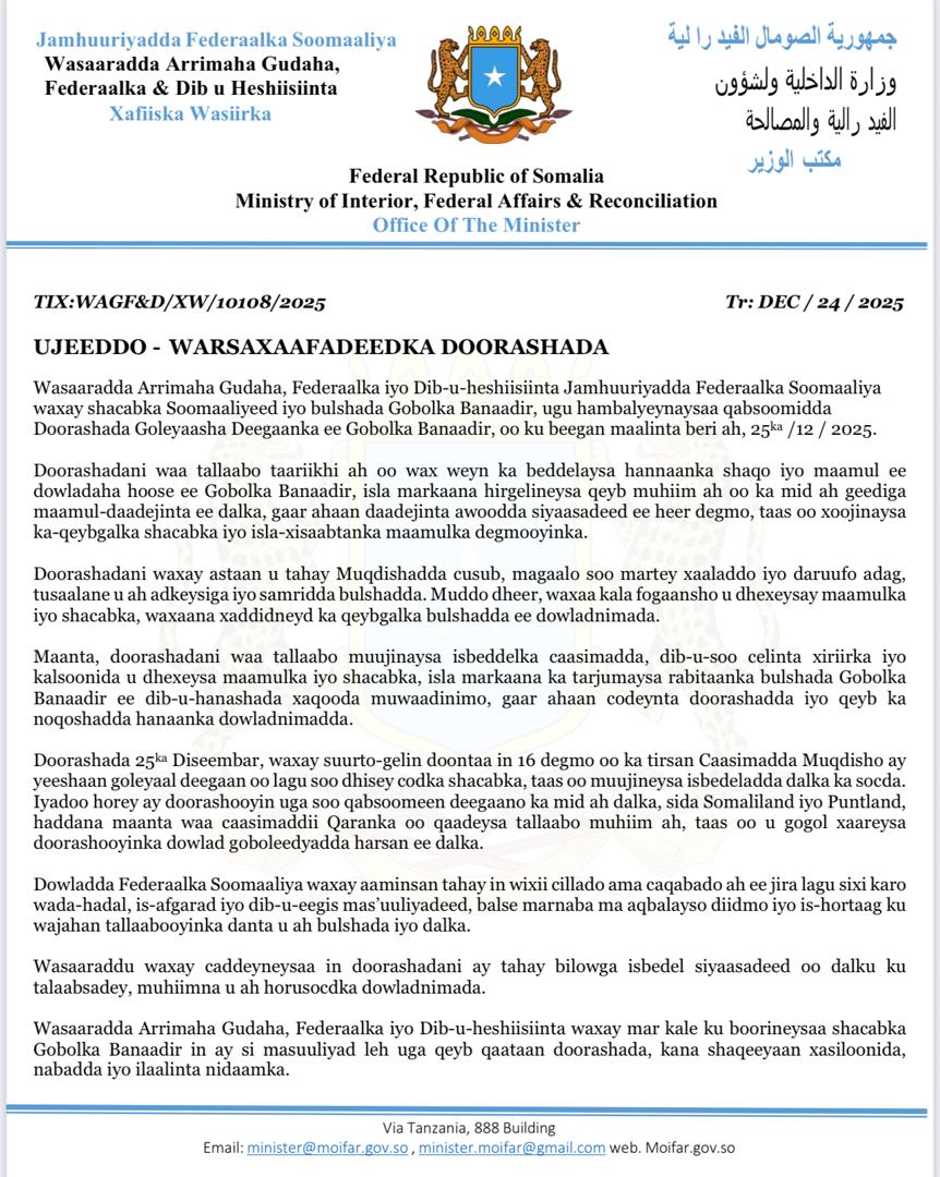 MOGADISHU, Somalia – The Ministry of Interior, Federal Affairs and Reconciliation has issued a formal press statement celebrating the upcoming local council elections in the Benadir region as a transformative event for the nation. In a communique released today, the Ministry extended its congratulations to the Somali public, particularly the residents of Mogadishu, ahead of the polls scheduled for tomorrow, December 25, 2025.