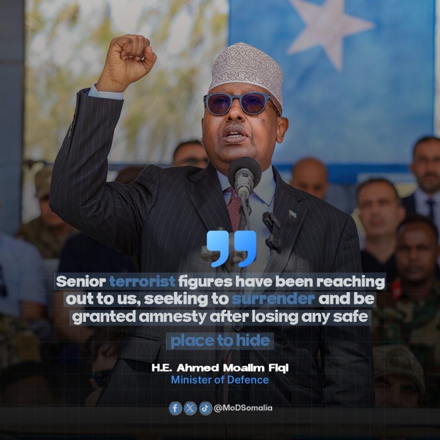 Mogadishu, (SONNA) — The Minister of Defense of the Federal Government of Somalia, H.E. Ahmed Macallin Fiqi, has said that senior Al-Shabaab terrorists are directly contacting the government, expressing their willingness to surrender and requesting amnesty.