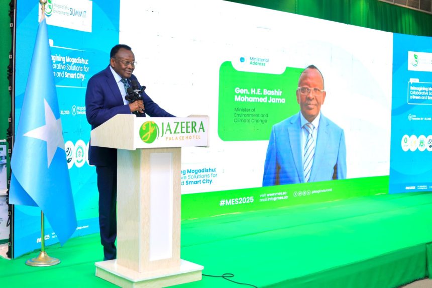 Mogadishu, (SONNA) — The Minister of Environment and Climate Change of the Federal Government of Somalia, H.E. Gen. Bashir Mohamed Jama stressed the need for a strong environmental consideration across all sectors, noting that climate action must be integrated nationwide at the Mogadishu Environmental Summit.