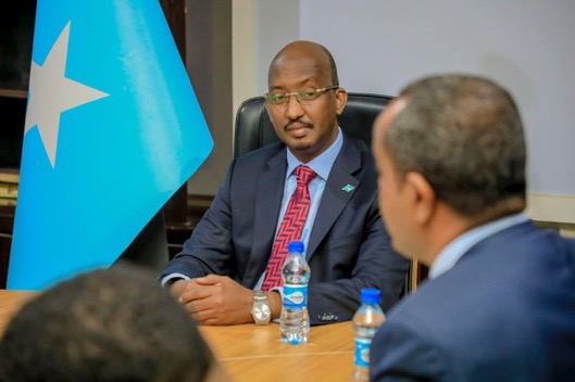 Mogadishu, (SONNA) — The Minister of Fisheries and Blue Economy of the Federal Government of Somalia, H.E. Ahmed Hassan Aden, accompanied by the Deputy Minister, H.E. Ali Ifiye Ali, held a meeting with the Acting Ambassador of the Federal Democratic Republic of Ethiopia, H.E. Ketema Haile, and a delegation of business leaders he led.