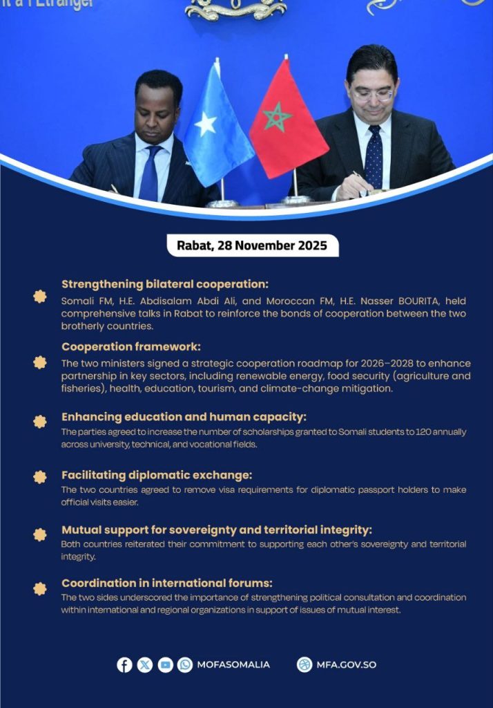 The talks were conducted in the spirit of a “South–South” partnership between two African nations, signaling renewed momentum in Somali–Moroccan relations and a shared determination to build a strong, diversified, and forward-looking cooperation framework.