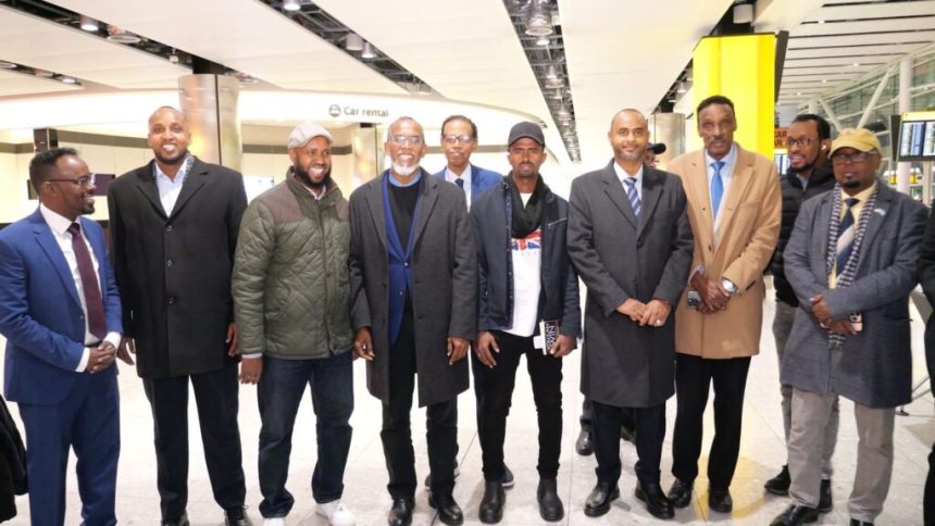 Somalia’s Ambassador to the United Kingdom, H.E. Abdulkadir Abdi Hashi, together with members of the Somali community in the UK, warmly welcomed the delegation upon their arrival at Heathrow Airport.