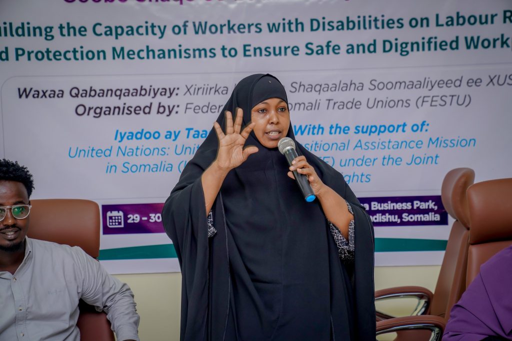 In addition, a specialised training session for women and young workers was held in Mogadishu to strengthen their understanding of the rights enshrined in the law and how young workers can claim their rights and resist exploitation and abuse while pursuing decent work. Further dedicated training for workers who are persons with disabilities took place in Mogadishu, marking the first time that persons with disabilities received sessions specifically tailored to their labour rights and inalienable right to inclusion and equal treatment.
