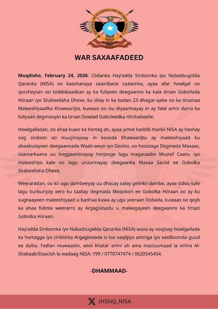 MOGADISHU (SONNA) — The National Intelligence and Security Agency (NISA), operating in close coordination with international security partners, successfully executed four targeted military operations this week, resulting in the elimination of more than 23 Al-Shabaab militants. The preemptive strikes spanned multiple locations across the Hiiraan and Middle Shabelle regions. These precision operations were strategically designed to dismantle active militant cells that were in the advanced stages of planning coordinated attacks against civilian and government targets within the Hirshabelle State.