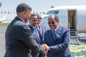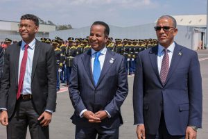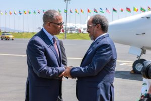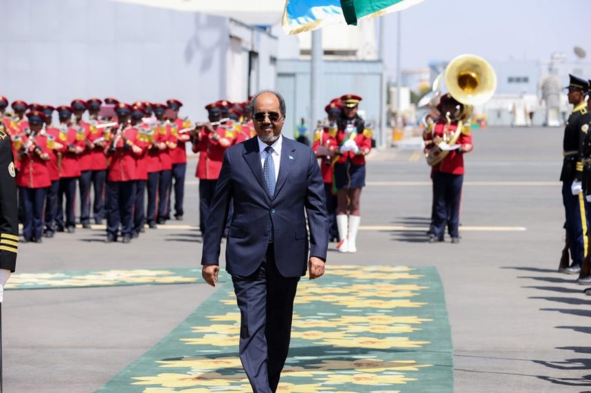 ADDIS ABABA (SONNA) — The President of the Federal Republic of Somalia, H.E. Hassan Sheikh Mohamud, arrived in Addis Ababa on Friday, leading a high-level delegation to participate in the 39th Ordinary Session of the Assembly of the Heads of State and Government of the African Union. The President and his team received a warm diplomatic reception upon their arrival in the Ethiopian capital.