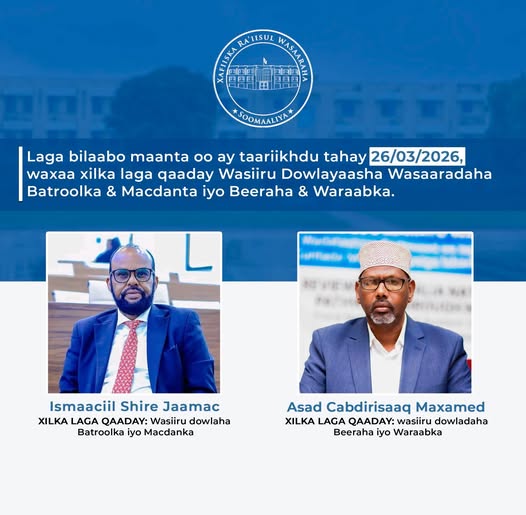 MOGADISHU (SONNA) — The Prime Minister of the Federal Republic of Somalia, H.E. Hamza Abdi Barre, executed a targeted administrative restructuring today by officially dismissing two high-ranking officials from the federal cabinet. The executive decree immediately removes the State Minister of the Ministry of Petroleum and Mineral Resources, Ismail Shire Jama, and the State Minister of the Ministry of Agriculture and Irrigation, Asad Abdirizak Mohamed, from their respective posts. This decisive action is engineered to restructure departmental leadership and accelerate the strategic output of these critical government sectors.
