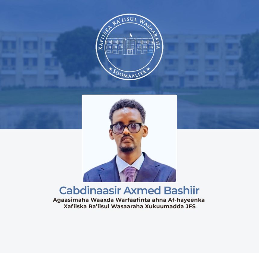 Mogadishu, (SONNA) — The Prime Minister of the Federal Government of Somalia, H.E. Hamza Abdi Barre, has appointed Abdinasir Ahmed Bashir as the Director of the Information Department and Spokesperson of the Office of the Prime Minister, effective today.