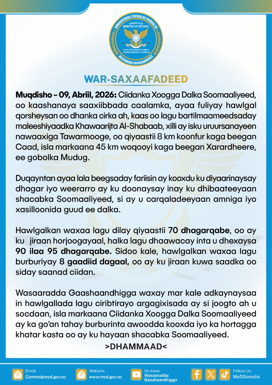 The Ministry of Defence officially confirmed the success of the operation and reiterated its absolute commitment to the total eradication of terrorist elements from Somali territory. The Ministry emphasized that the SNAF maintains full operational tempo and will continuously execute aggressive operations to systematically degrade the Kharijites’ capabilities, ensuring the permanent security and stability of the Somali people.