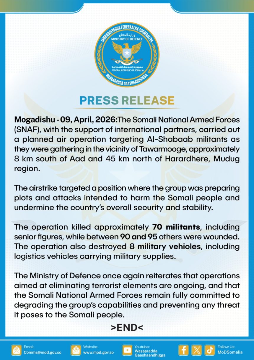 MOGADISHU (SONNA) — The Somali National Armed Forces (SNAF), operating in direct coordination with international defense partners, executed a highly successful, intelligence-driven air operation against Khawaarij militants in the Mudug region. The precision strike targeted a major militant gathering in the vicinity of Tawarmooge, located approximately 8 kilometers south of Aad and 45 kilometers north of Harardhere.