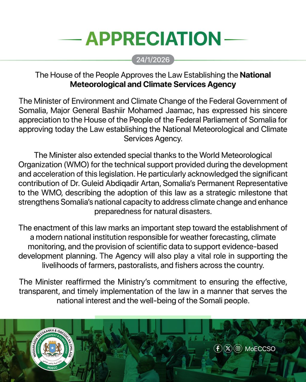 The Minister of Environment and Climate Change, Major General Bashiir Mohamed Jaamac, expressed his sincere appreciation to the House of the People for passing the legislation and extended special thanks to the World Meteorological Organization (WMO) for its technical support during the law’s development. He highlighted the key role of Dr. Guleid Abdiqadir Artan, Somalia’s Permanent Representative to the WMO, in facilitating the adoption of the law.