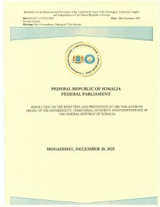 Directive to Government: The Parliament directed the Federal Government to immediately transmit the resolution to major international bodies, including the UN, AU, and IGAD, to reaffirm the Somali people’s right to national security and territorial unity.