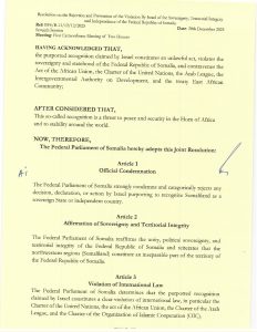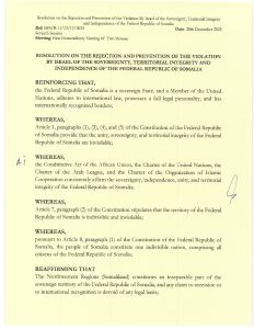 The resolution entered into force immediately upon its approval by both houses, signed by the Speaker of the House of the People, Hon. Sheikh Adan Mohamed Nur (Madobe), and the 1st Deputy Speaker of the Upper House, Sen. Ali Sha’ban Ibrahim.