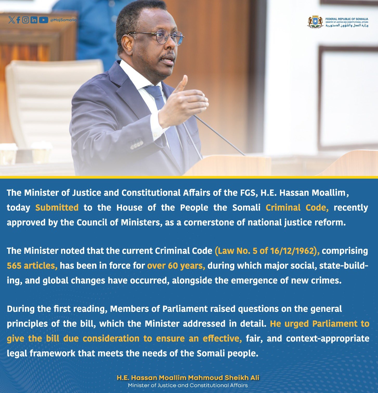 Mogadishu(SONNA)-The Minister of Justice and Constitutional Affairs, H.E. Hassan Moallim, has submitted the Somali Criminal Code to the House of the People following its approval by the Council of Ministers.