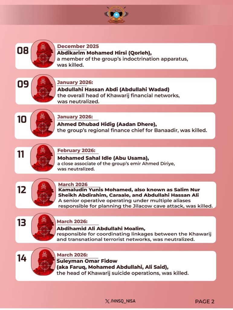 Mogadishu, (SONNA) — The National Intelligence and Security Agency (NISA) of Somalia has released a list of 14 senior Al-Shabaab terrorists eliminated over the past 10 months in coordinated operations carried out with the support of international security partners.