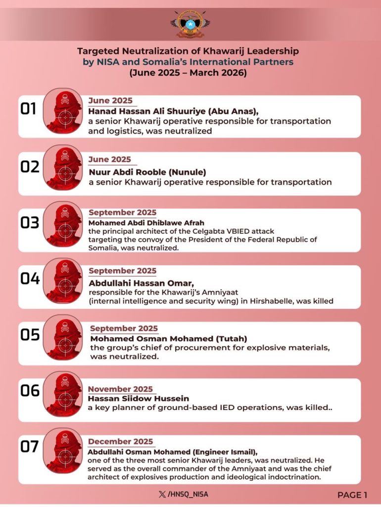 Mogadishu, (SONNA) — The National Intelligence and Security Agency (NISA) of Somalia has released a list of 14 senior Al-Shabaab terrorists eliminated over the past 10 months in coordinated operations carried out with the support of international security partners.