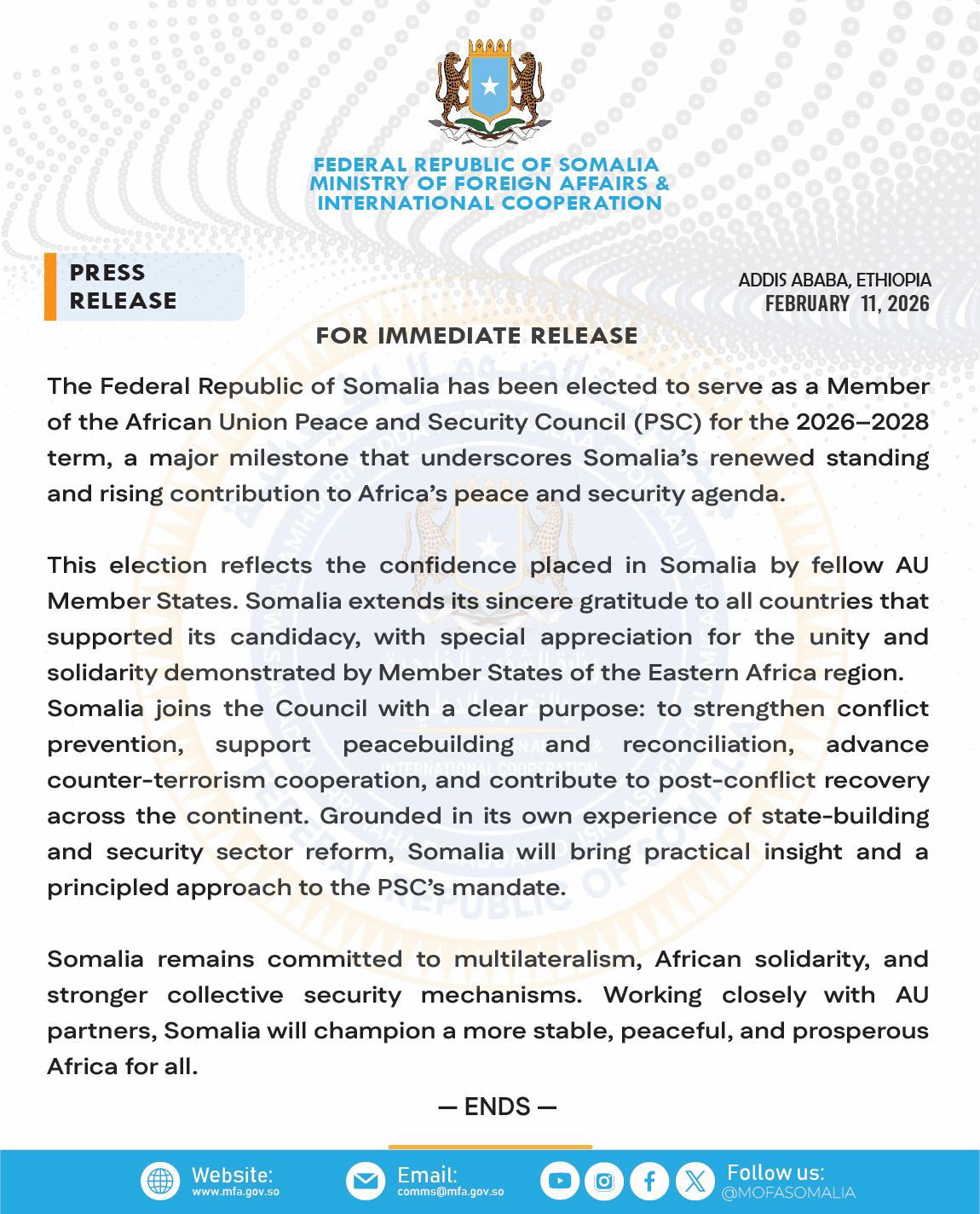 This seat on the Council places Mogadishu at the table where critical decisions regarding African collective security are made. The Federal Government reaffirmed its commitment to multilateralism, pledging to work closely with AU partners to champion a more stable and prosperous Africa for all.