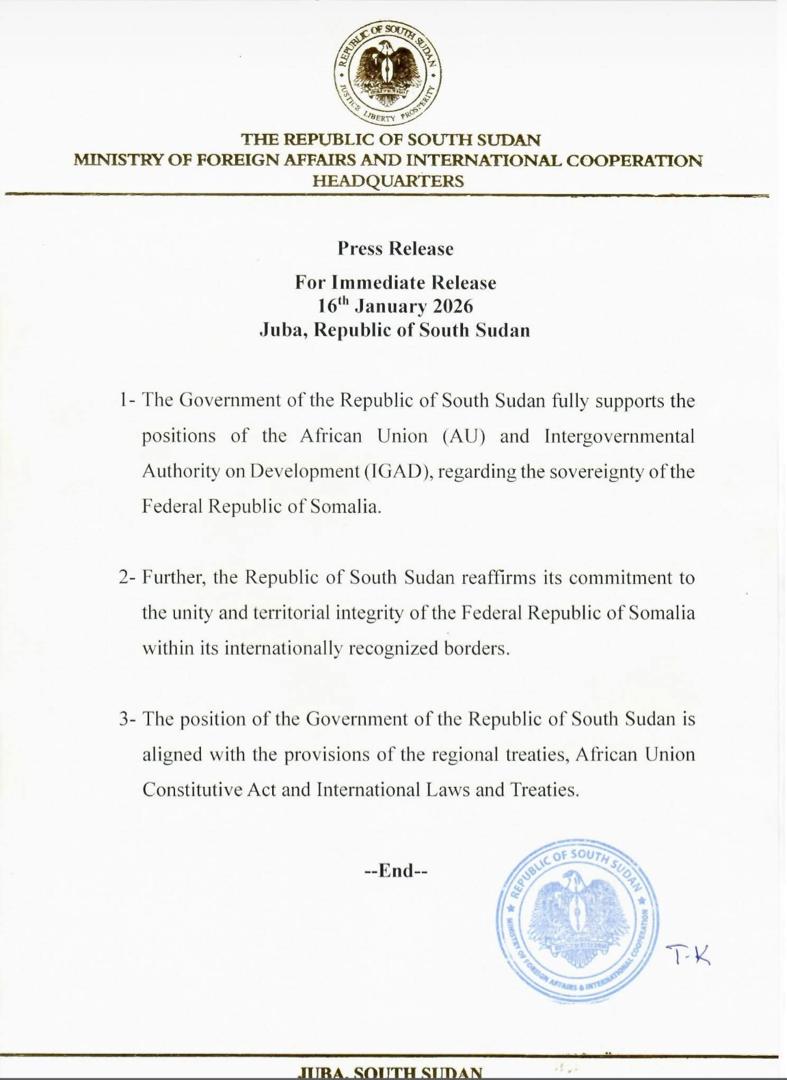 JUBA, South Sudan – The Republic of South Sudan has formally declared its absolute support for the unity and territorial integrity of the Federal Republic of Somalia, adding its voice to the growing regional consensus against external attempts to fracture the Horn of Africa nation. In an official press statement released on Friday, the Ministry of Foreign Affairs and International Cooperation in Juba affirmed that South Sudan stands firmly with the African Union (AU) and the Intergovernmental Authority on Development (IGAD) in defending Mogadishu’s sovereignty.