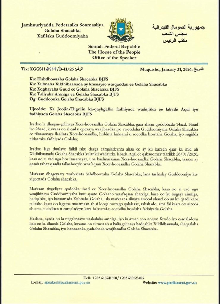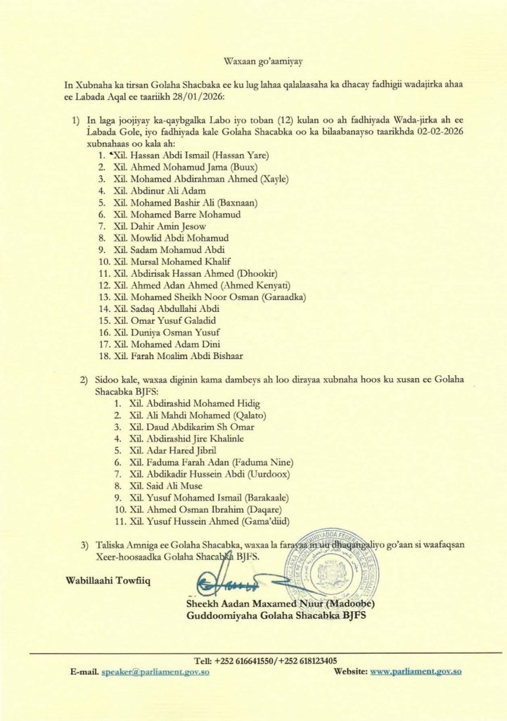 In addition, the Speaker issued a final warning to several members of the House of the People accused of involvement in the disruption. He stressed the need to uphold parliamentary order, discipline, and internal rules, and emphasized the importance of protecting the dignity and institutional integrity of the Federal Parliament of Somalia.