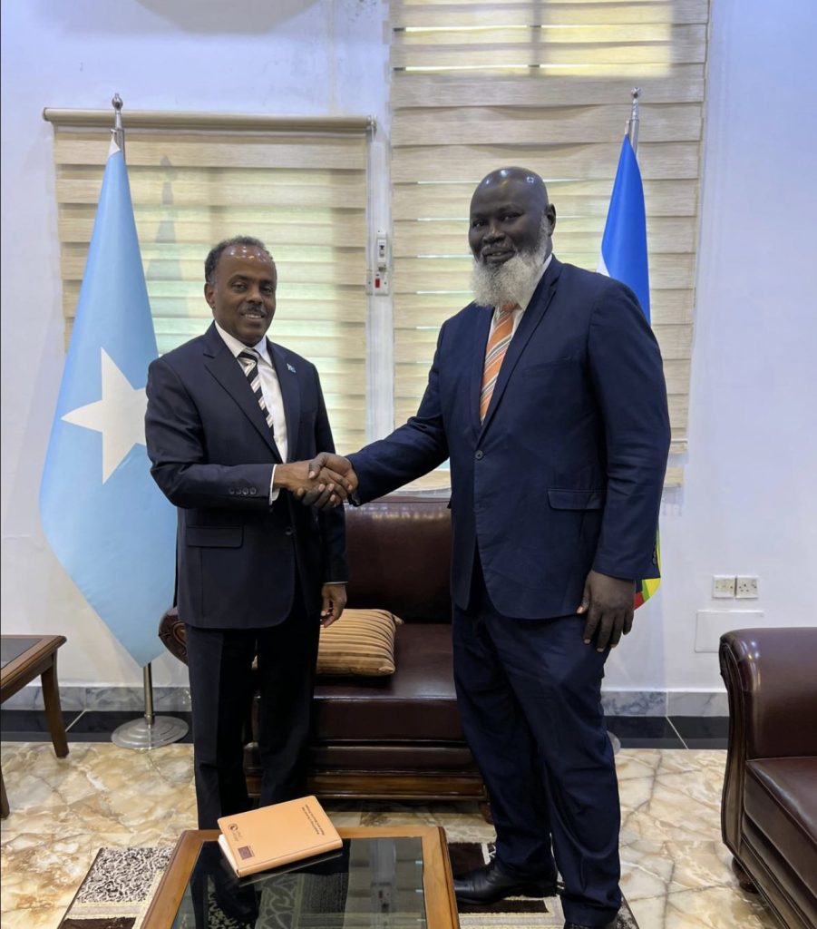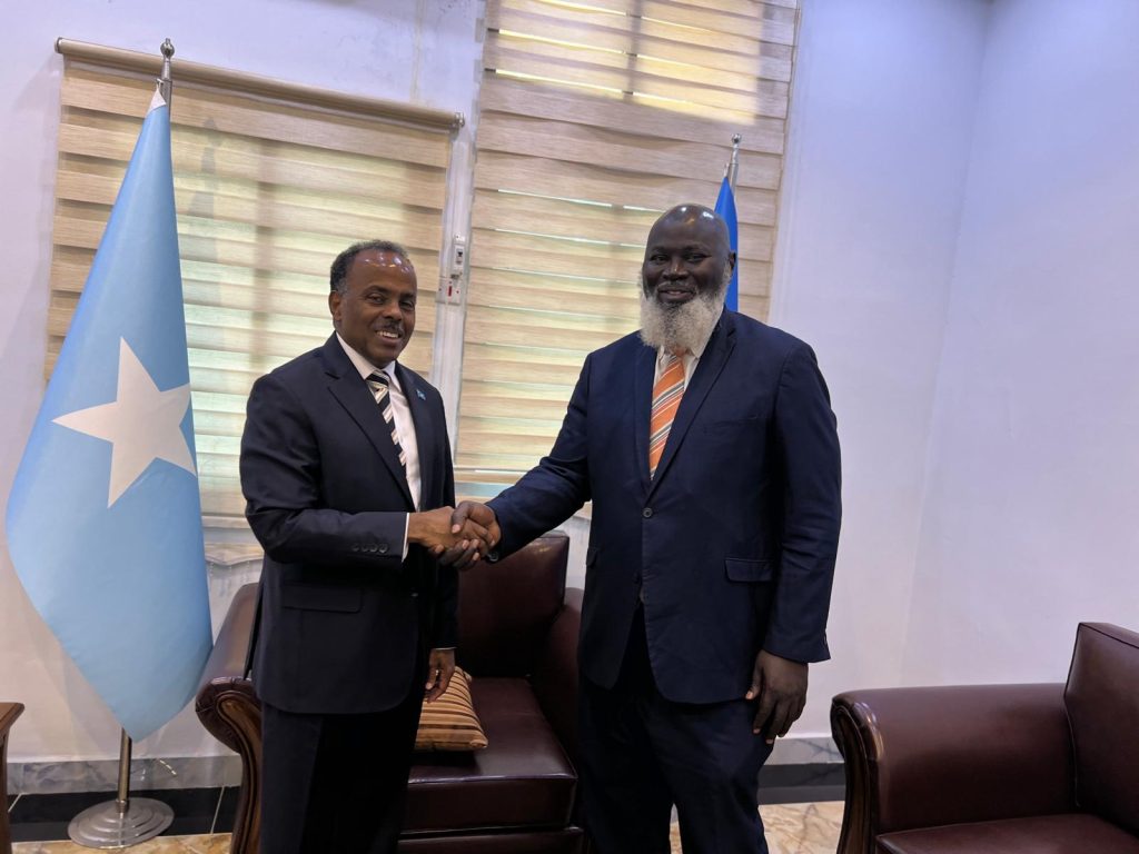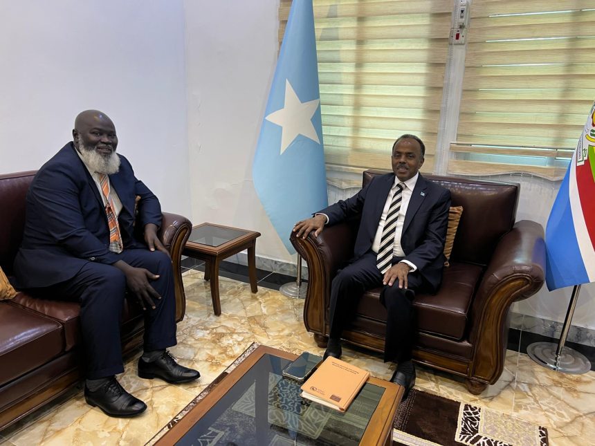 Mogadishu, (SONNA) — The State Minister for Foreign Affairs and International Cooperation of the Federal Government of Somalia, H.E. Ali Mohamed Omar, met today in Mogadishu with the Special Representative of the Chairperson of the African Union Commission and Head of the African Union Transition Mission in Somalia (AUSSOM), Ambassador El Hadji Ibrahima Diene.