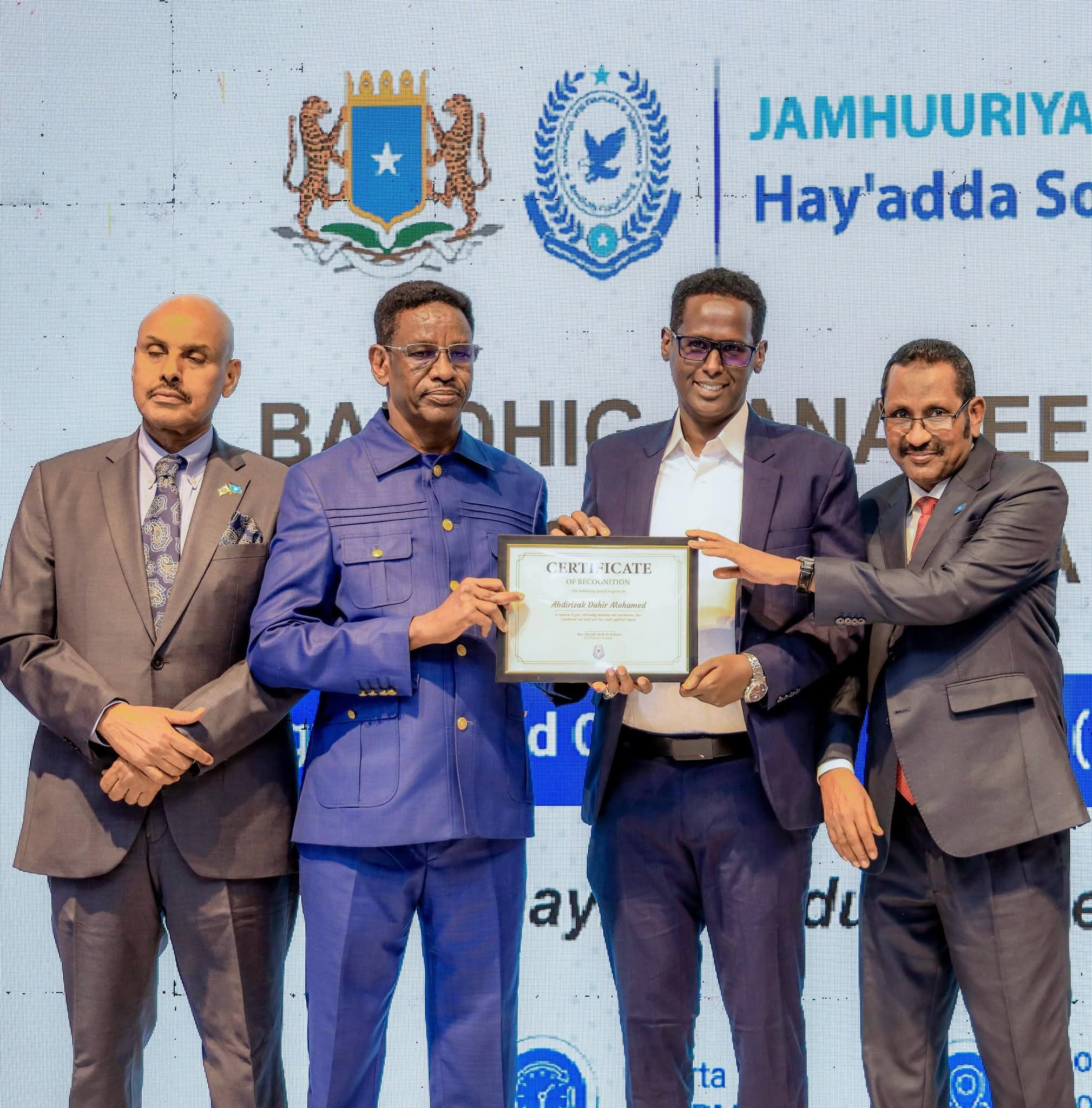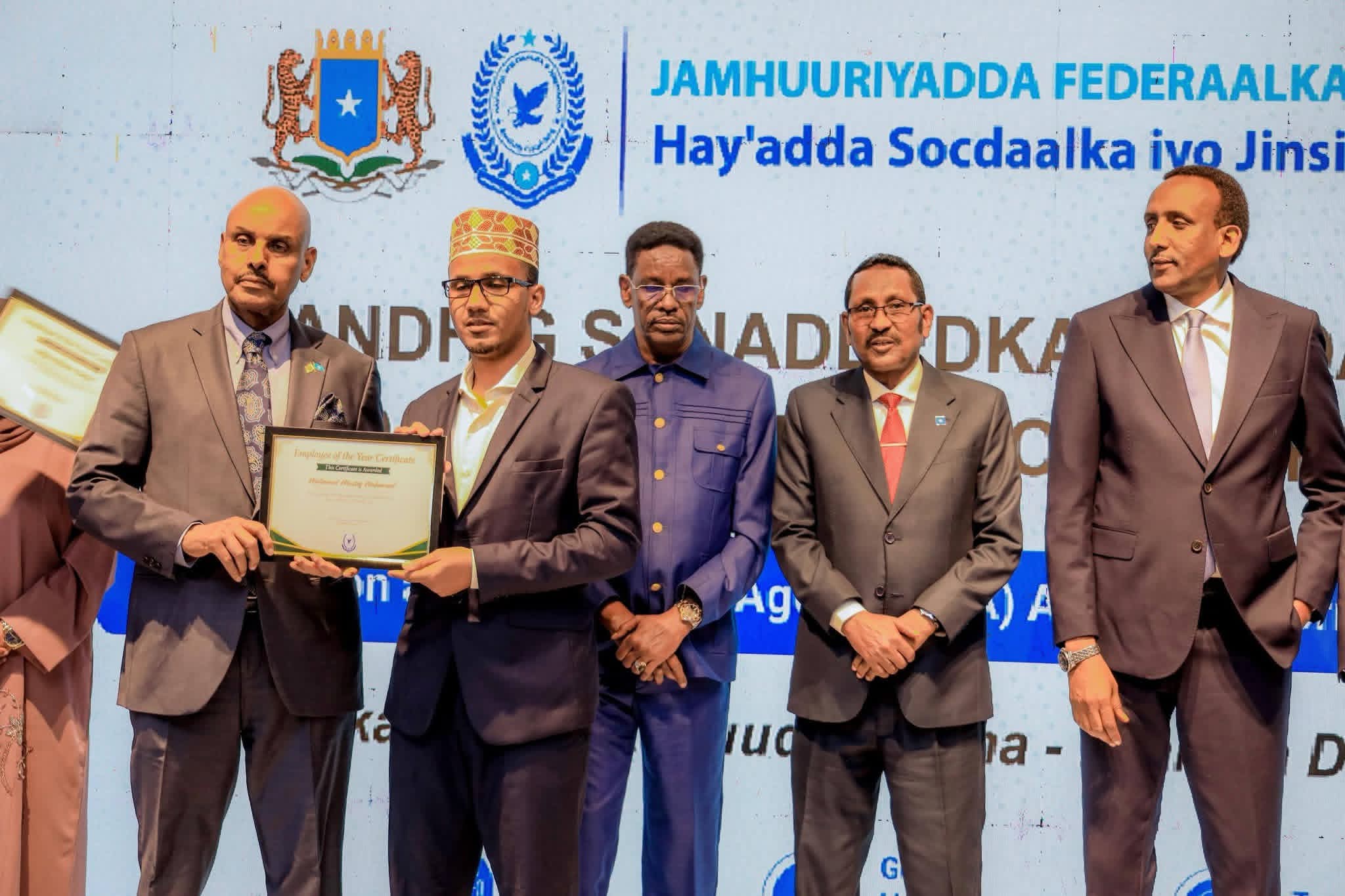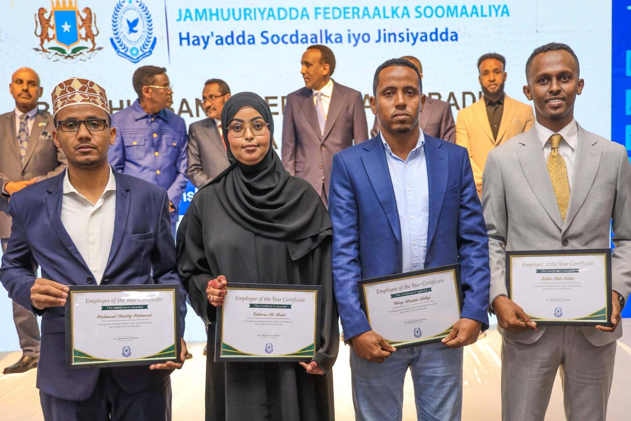 Muqdisho(SONNA):-Mas’uuliyiin sare oo ugu horeeyo Wasiirka Wasaaradda Amniga Gudaha, Mudane Gen. Abdullaahi Sh. Ismail Fartaag, Agaasimaha Guud ee HSJ, Mudane Mustafa Duhulow iyo Guddoomiyaha Guddiga Amniga ee Barlamaanka JFS, Mudane Nuur Axmed Diiriye, ayaa guddoonsiiyay Abaalmarino saraakiisha loo aqoonsaday inay sanadkan 2025 kaalin weyn ka qaateen horumarinta iyo isbedelka shaqo ee Hay’adda.