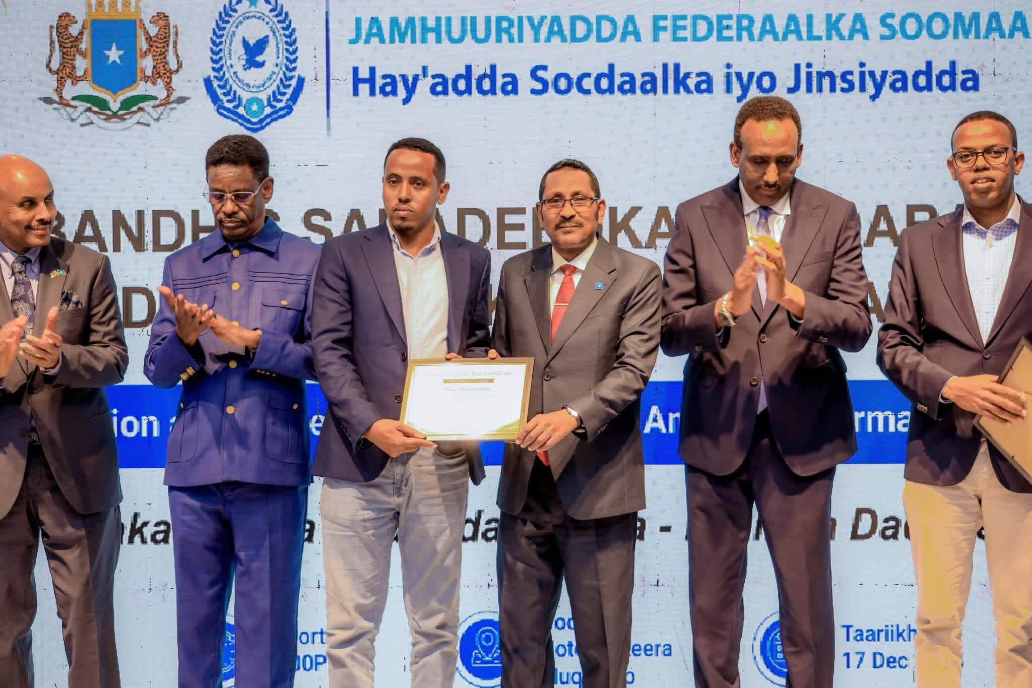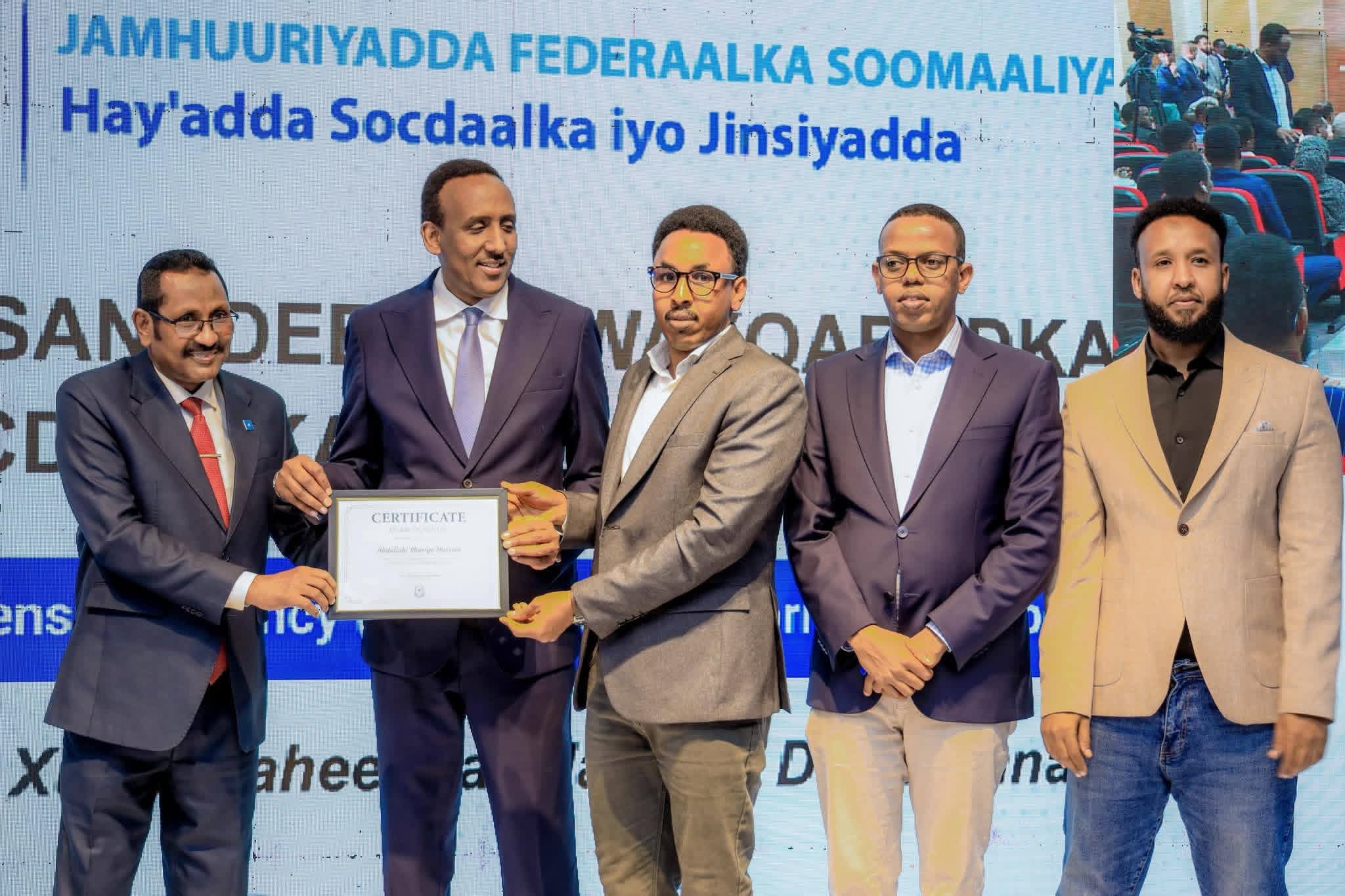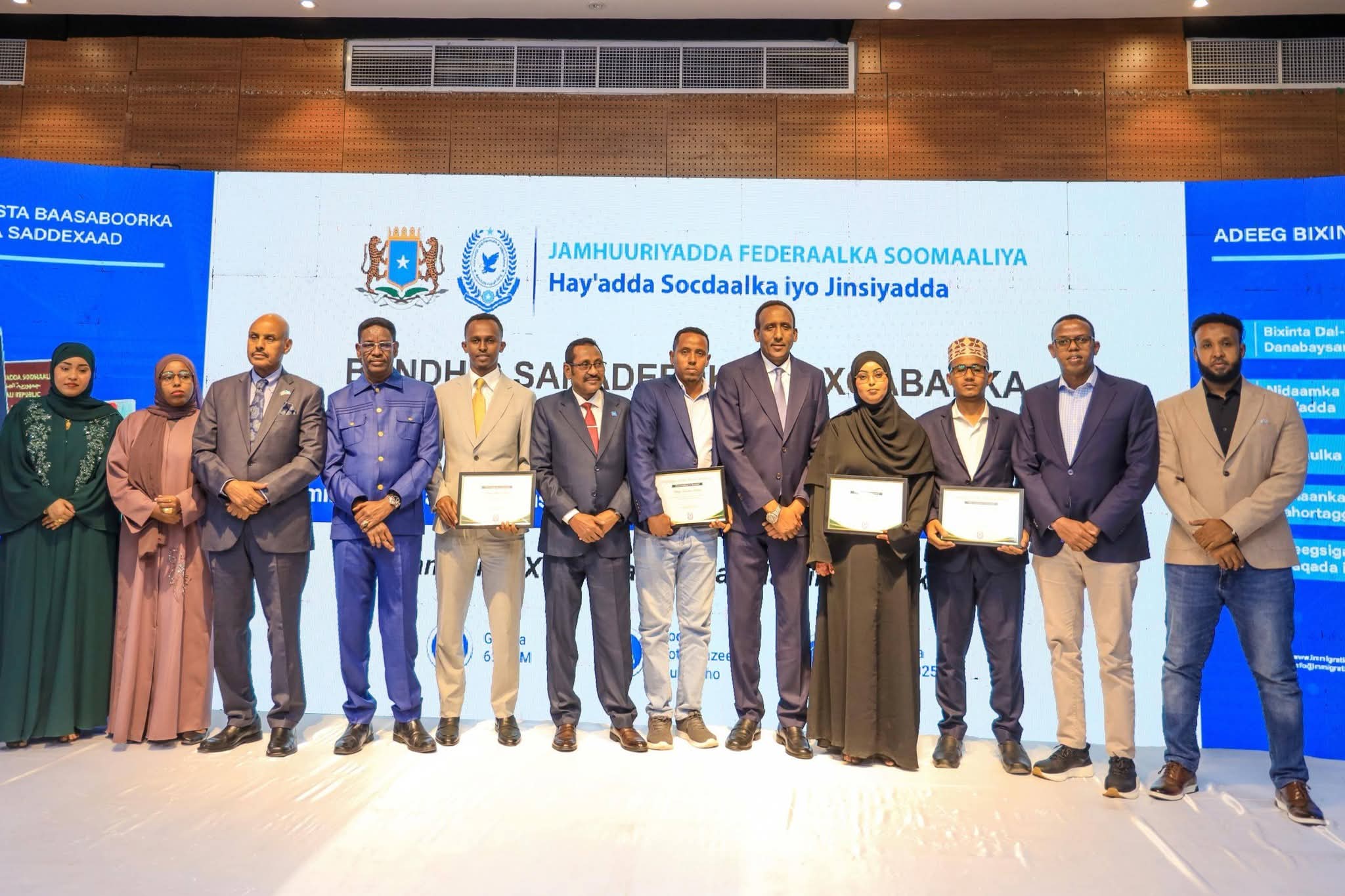 Muqdisho(SONNA):-Mas’uuliyiin sare oo ugu horeeyo Wasiirka Wasaaradda Amniga Gudaha, Mudane Gen. Abdullaahi Sh. Ismail Fartaag, Agaasimaha Guud ee HSJ, Mudane Mustafa Duhulow iyo Guddoomiyaha Guddiga Amniga ee Barlamaanka JFS, Mudane Nuur Axmed Diiriye, ayaa guddoonsiiyay Abaalmarino saraakiisha loo aqoonsaday inay sanadkan 2025 kaalin weyn ka qaateen horumarinta iyo isbedelka shaqo ee Hay’adda.