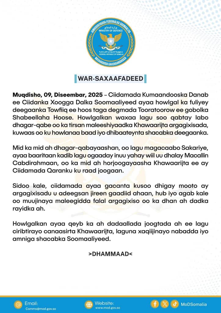 Howlgalkan ayaa qeyb ka ah dadaallada joogtada ah ee lagu ciribtirayo canaasirta Khawaarijta, laguna xaqiijinayo nabadda iyo amniga shacabka Soomaaliyeed.