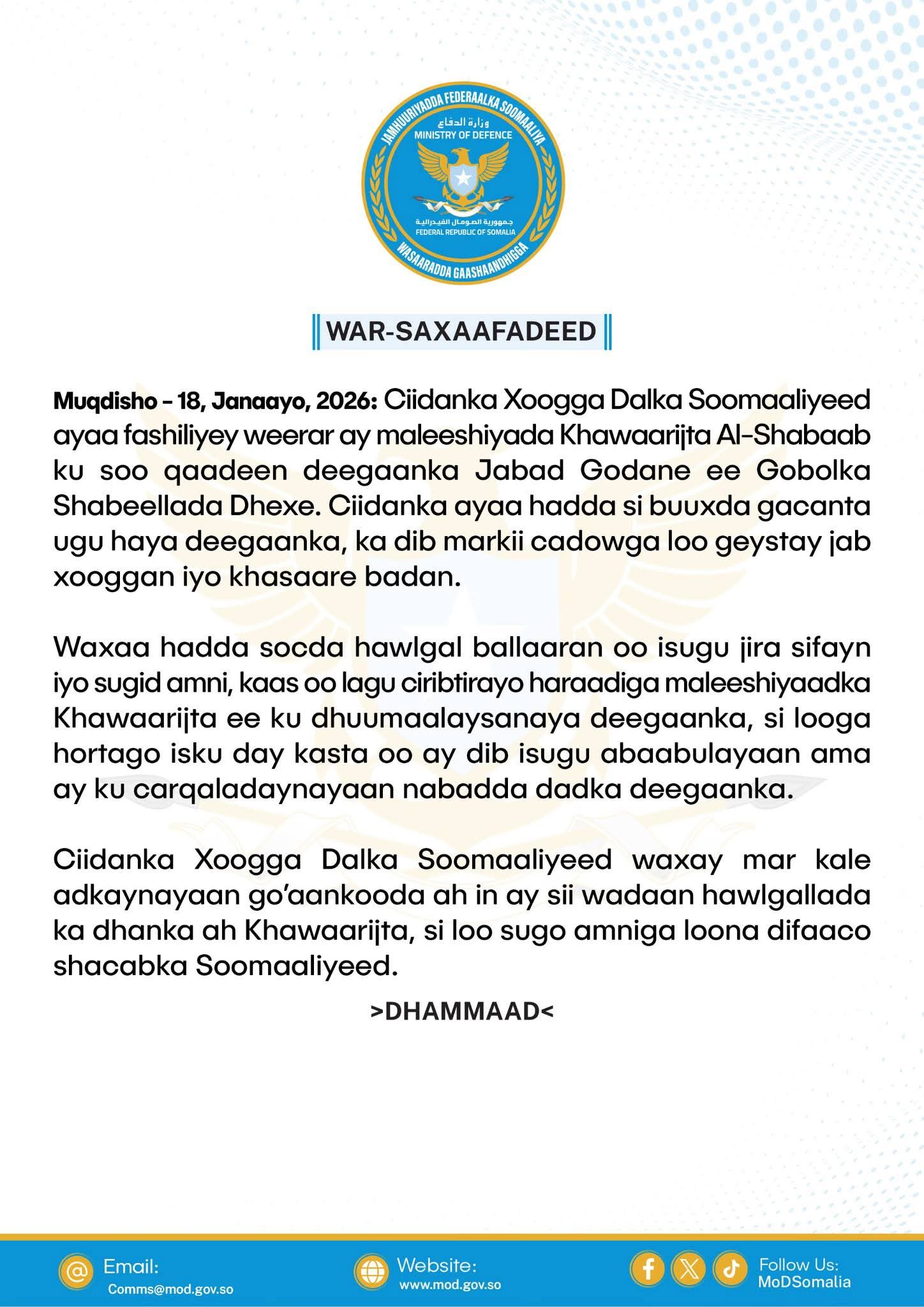 Muqdisho(SONNA):-Ciidanka Xoogga Dalka Soomaaliyeed ayaa fashiliyey weerar ay maleeshiyada Khawaarijta Al-Shabaab ku soo qaadeen deegaanka Jabad Godane ee Gobolka Shabeellada Dhexe. Ciidanka ayaa hadda si buuxda gacanta ugu haya deegaanka, ka dib markii cadowga loo geystay jab xooggan iyo khasaare badan.