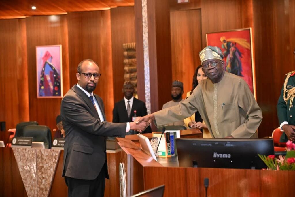 Abuja (SONNA): Danjiraha cusub ee Jamhuuriyadda Federaalka Soomaaliya u fadhiya dalka Nigeria mudane Maxamed Cusmaan Maxamed ayaa si rasmi ah waraaqaha aqoonsiga safiirnimo ugu gudbiyay Madaxweynaha Jamhuuriyadda Federaalka Nigeria, Bola Ahmed Tinubu, oo ka guddoomay xaflad rasmi ah.