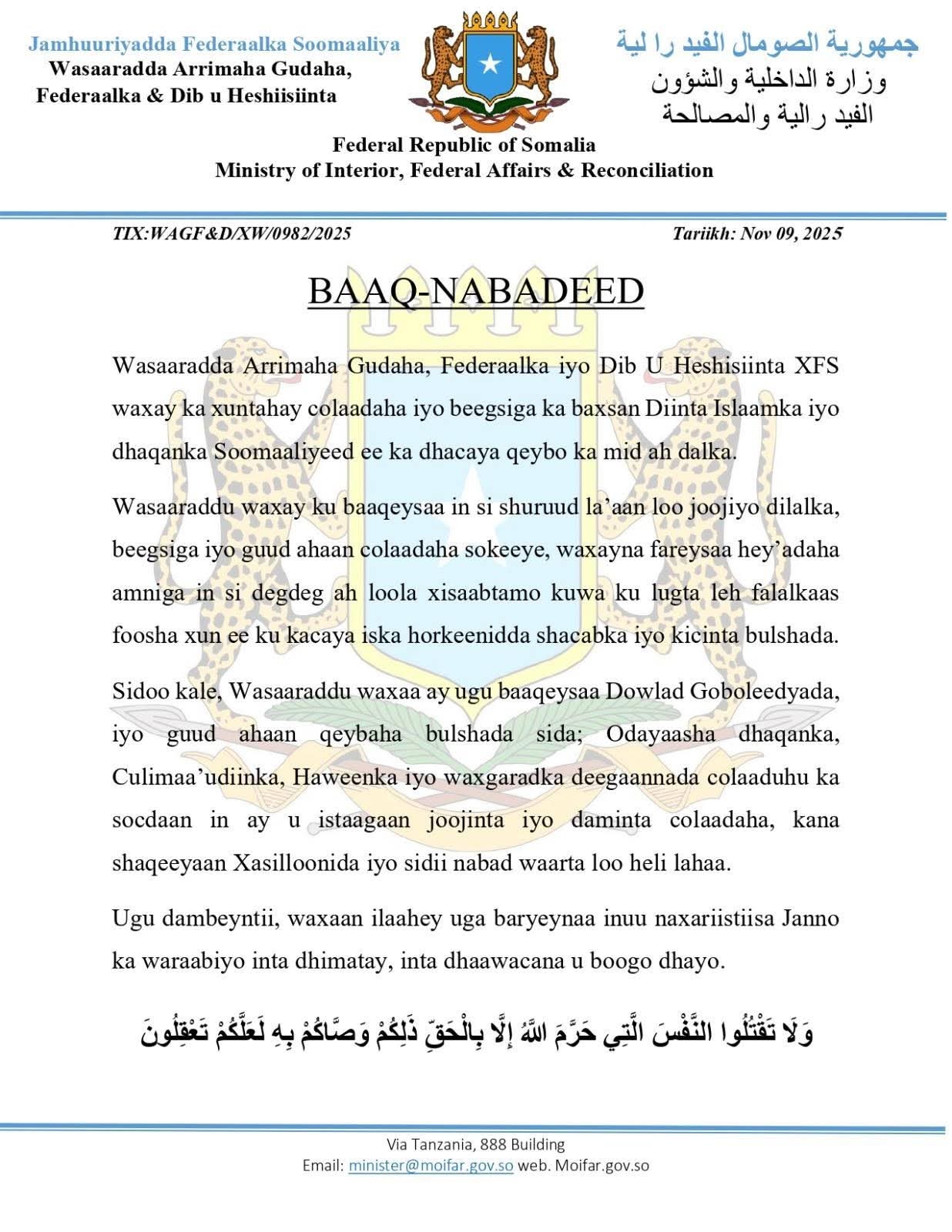 Muqdisho(SONNA):-Wasaaradda Arrimaha Gudaha, Federaalka iyo Dib-u-heshiisiinta XFS ayaa baaq nabadeed kasoo saartay, Dilalka iyo Beegsiga ka baxsan Diinta Islaamka iyo Dhaqanka Soomaaliyeed ee ka dhacaya qeybo ka mid ah dalka.