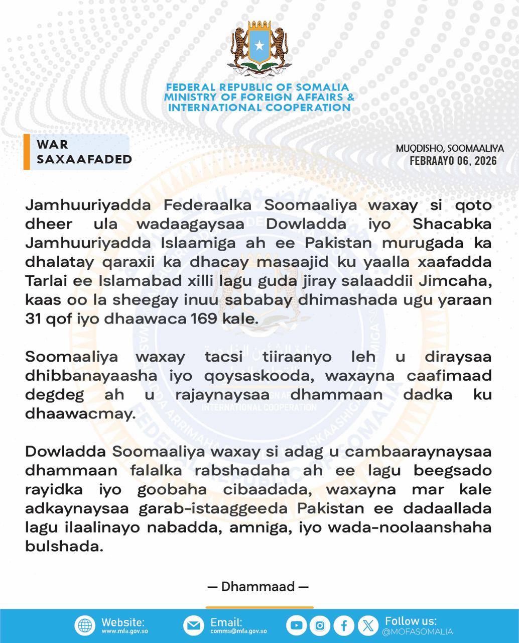 Dowladda Soomaaliya waxay si adag u cambaaraynaysaa dhammaan falalka rabshadaha ah ee lagu beegsado rayidka iyo goobaha cibaadada, waxayna mar kale adkaynaysaa garab-istaaggeeda Pakistan ee dadaallada lagu ilaalinayo nabadda, amniga, iyo wada-noolaanshaha bulshada.