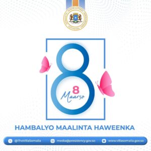 Muqdisho,(SONNA):- Hambalyo iyo bogaadin ayaan u dirayaa dhammaan haweenka Soomaaliyeed, meel kasta oo ay joogaan, taas oo ku aaddan munaasabadda Maalinta Haweenka Adduunka ee 8 Maarso.
