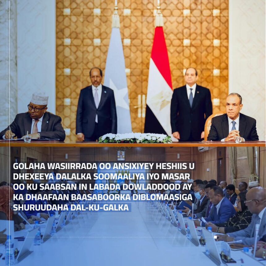 Muqdisho(SONNA):-Golaha Wasiirrada Jamhuuriyadda Federaalka Soomaaliya oo uu shir-guddoominayay kulankoodii maanta oo Khamiis ah Ra’iisul wasaaraha, Mudane Xamsa Cabdi Barre, ayaa lagu ansixiyey heshiis u dhexeeya dalalka Soomaaliya iyo Masar oo ku saabsan in labada dowladdood ay ka dhaafaan baasaboorka diblomaasiga shuruudaha dal-ku-galka, tani oo oggolaanaysa in muwaadiniinta haysta ay si shuruud laโaan ah ku gali karaan, kagana bixi karaan labada dal muddo 90 maalmood ah.