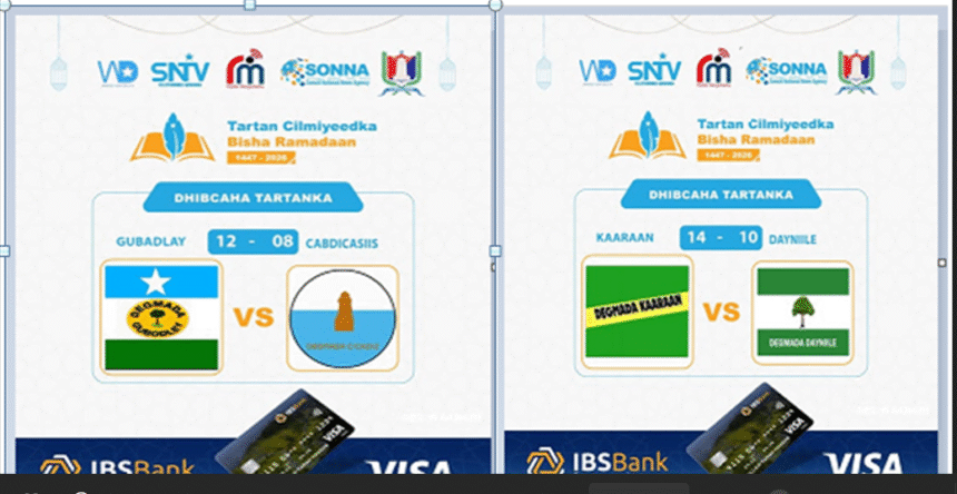 Muqdisho.SONNA…Degmada Gubadleey ayaa xalay tartan cilmiyeedka warbaahinta qaranka ka reebtay degmada Cabdi Casiis,halka Degmada Kaaraan ay iyaduna ka adkaatay dhigeeda Daayniile.