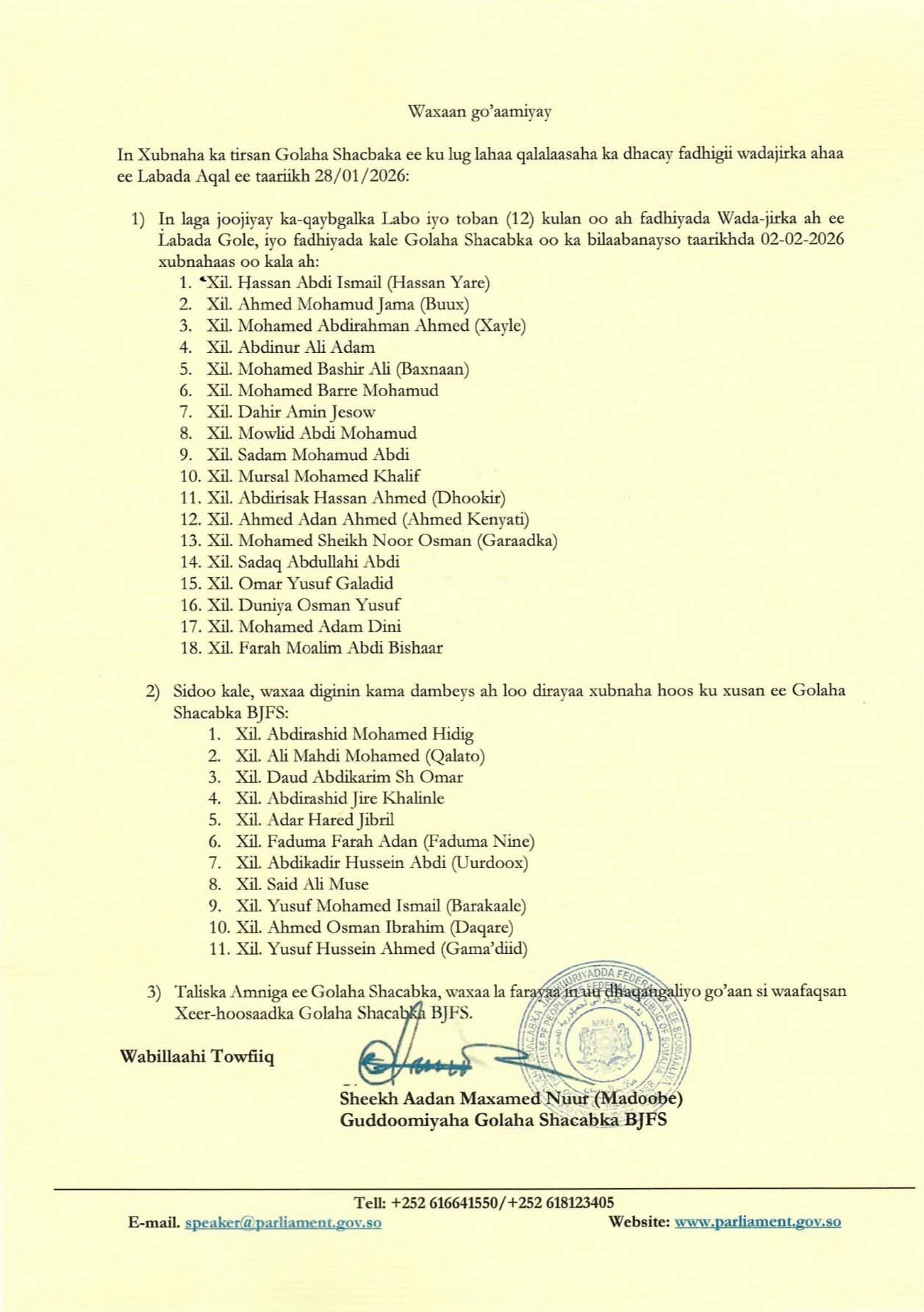 Muqdisho(SONNA);-Guddoomiyaha Golaha Shacabka ee Baarlamaanka Jamhuuriyadda Federaalka Soomaaliya, Mudane Sheekh Aadan Maxamed Nuur (Madoobe) ayaa soo saaray go’aanno rasmi ah oo la xiriira joojinta fadhiyada guud ee wadajirka ah ee labada Aqal ee Baarlamaanka iyo sidoo kale fadhiyada Golaha Shacabka, kaddib qalalaase ka dhacay fadhigii wadajirka ahaa ee labada Aqal, kaas oo qabsoomay 28-kii Janaayo, 2026.